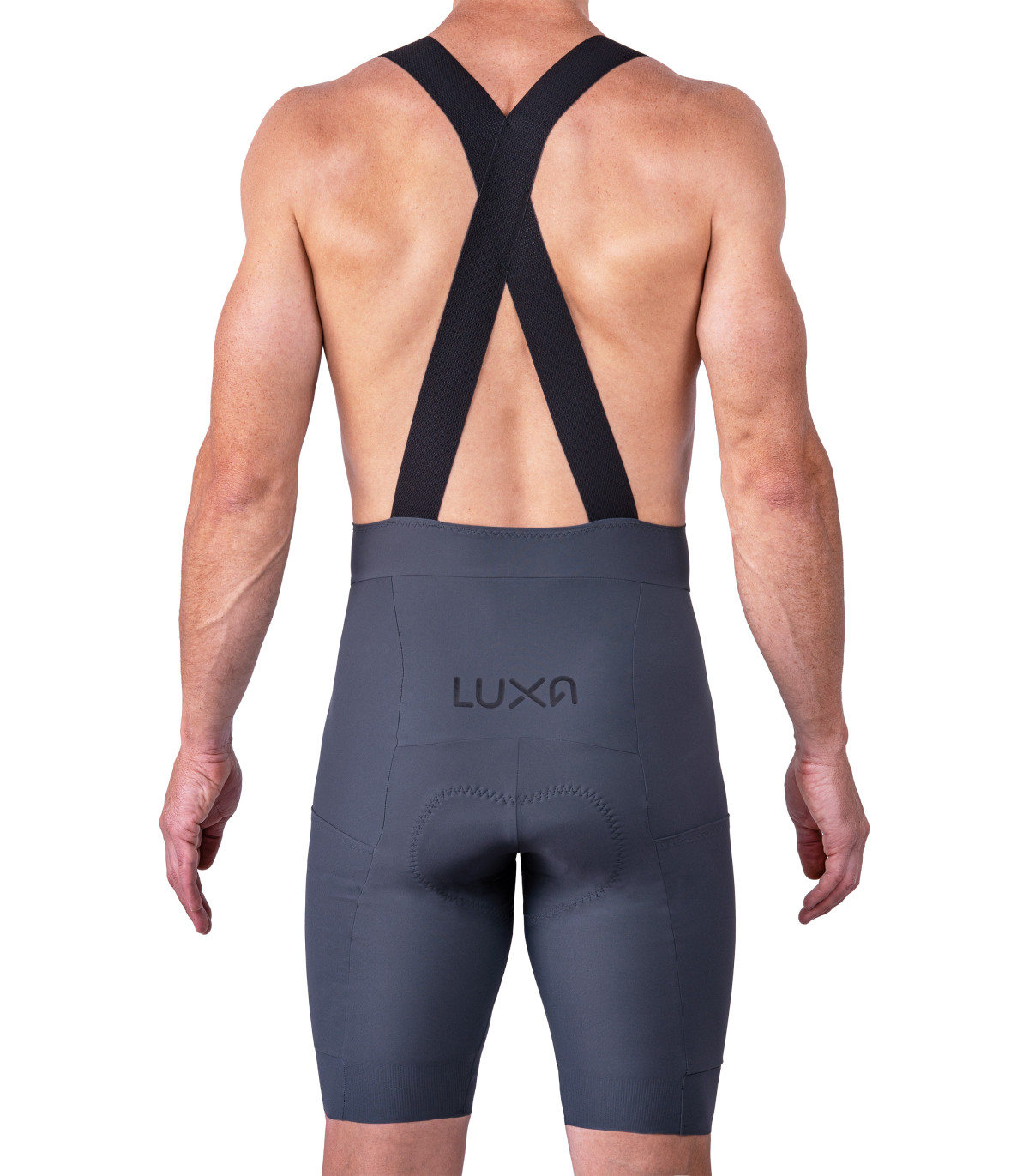 szare spodenki kolarskie - tylne ujęcie na przewiewne szelki X, stworzone na długie dystanse